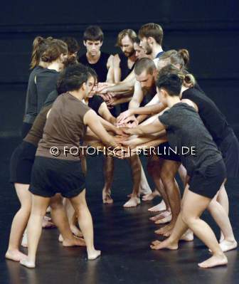 Ort: Hebbel am Ufer, hau 2. Isabelle Schad. Titel: COLLECTIVE JUMPS. Premiere: 28.11.2014 Konzept, Choreographie: Isabelle Schad, Laurent Goldring. Licht: Mehdi Toutain-Lopez. Kostueme: Lea Girod. Performance, Tanz: Juan Cobeis, Hana Erdman, Naima Ferre, Jasmin Ihrac, Przemyslaw Kaminski, Roni Katz, Mathis Kleinschnittger, Inna Krasnoper, Aoife McAtamney, Zwoisy Mears-Clarke, Lea Moro, Benjamin Pohlig, Julia Rodriguez, Claudia Tomasi, Nir Vidan, Sunniva Vikor Egenes. Im Bild: Ensemble
