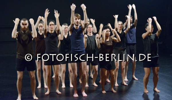 Ort: Hebbel am Ufer, hau 2. Isabelle Schad. Titel: COLLECTIVE JUMPS. Premiere: 28.11.2014 Konzept, Choreographie: Isabelle Schad, Laurent Goldring. Licht: Mehdi Toutain-Lopez. Kostueme: Lea Girod. Performance, Tanz: Juan Cobeis, Hana Erdman, Naima Ferre, Jasmin Ihrac, Przemyslaw Kaminski, Roni Katz, Mathis Kleinschnittger, Inna Krasnoper, Aoife McAtamney, Zwoisy Mears-Clarke, Lea Moro, Benjamin Pohlig, Julia Rodriguez, Claudia Tomasi, Nir Vidan, Sunniva Vikor Egenes. Im Bild: Ensemble