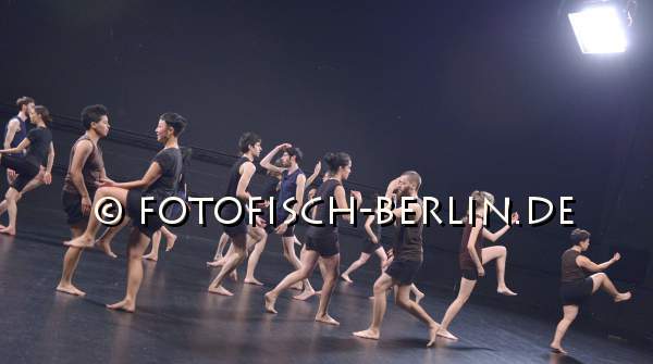 Ort: Hebbel am Ufer, hau 2. Isabelle Schad. Titel: COLLECTIVE JUMPS. Premiere: 28.11.2014 Konzept, Choreographie: Isabelle Schad, Laurent Goldring. Licht: Mehdi Toutain-Lopez. Kostueme: Lea Girod. Performance, Tanz: Juan Cobeis, Hana Erdman, Naima Ferre, Jasmin Ihrac, Przemyslaw Kaminski, Roni Katz, Mathis Kleinschnittger, Inna Krasnoper, Aoife McAtamney, Zwoisy Mears-Clarke, Lea Moro, Benjamin Pohlig, Julia Rodriguez, Claudia Tomasi, Nir Vidan, Sunniva Vikor Egenes. Im Bild: Ensemble