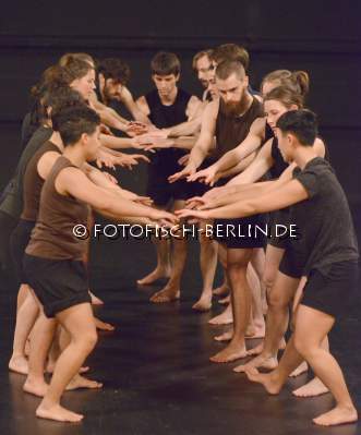 Ort: Hebbel am Ufer, hau 2. Isabelle Schad. Titel: COLLECTIVE JUMPS. Premiere: 28.11.2014 Konzept, Choreographie: Isabelle Schad, Laurent Goldring. Licht: Mehdi Toutain-Lopez. Kostueme: Lea Girod. Performance, Tanz: Juan Cobeis, Hana Erdman, Naima Ferre, Jasmin Ihrac, Przemyslaw Kaminski, Roni Katz, Mathis Kleinschnittger, Inna Krasnoper, Aoife McAtamney, Zwoisy Mears-Clarke, Lea Moro, Benjamin Pohlig, Julia Rodriguez, Claudia Tomasi, Nir Vidan, Sunniva Vikor Egenes. Im Bild: Ensemble