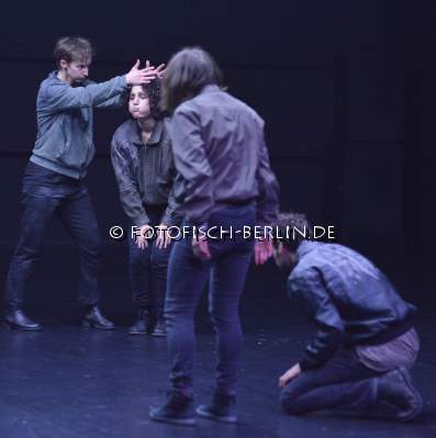 Ort: Hebbel am Ufer, hau 2. Kat Valastur. Titel: Ah! Oh! A Contemporary Ritual. Premiere: 5.12.2014. Konzept, Choreografie: Kat Valastur. Licht: Martin Beeretz. Kostueme: Lydia Sonderegger. Tanz: Sahar Levi, Leyla Postalcioglu, Annegret Schalke, Romain Thibaud-Rose, Enrico Ticconi, Marysia Zimpel Im Bild: Ensemble