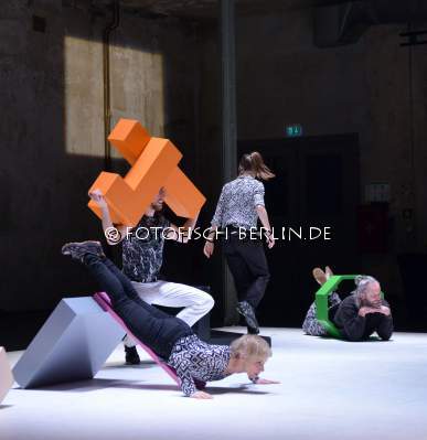 Ort: Sophiensaele. Julian Weber. Titel: FORMEN FORMEN. Premiere: 23.01.2015. Choreografie, Skulptur: Julian Weber. Licht: Annegret Schalke. Musik: Els Vandeweyer, Brendan Dougherty. Kreation, Tanz: Nik Haffner, Hermann Heisig, Peter Pleyer, Meg Stuart, Claudia Tomasi. Im Bild: Ensemble