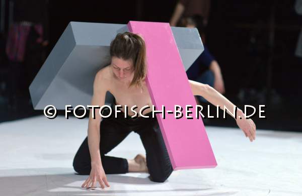 Ort: Sophiensaele. Julian Weber. Titel: FORMEN FORMEN. Premiere: 23.01.2015. Choreografie, Skulptur: Julian Weber. Licht: Annegret Schalke. Musik: Els Vandeweyer, Brendan Dougherty. Kreation, Tanz: Nik Haffner, Hermann Heisig, Peter Pleyer, Meg Stuart, Claudia Tomasi. Im Bild: Claudia Tomasi