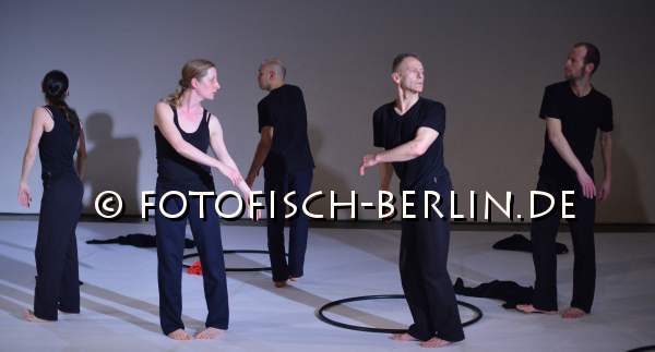Ort: Uferstudio 1. Tanzcompagnie Rubato. Titel: UNCERTAIN STATES. Urauffuehrung: 18.3.2015. Kuenstlerische Leitung, Idee, Buehne: Jutta Hell, Dieter Baumann. Inszenierung, Choreografie, Kostuem: Jutta Hell. Musik: Da Bao. Licht: Fabian Bleisch. Tanz, Choreografie: Mercedes Appugliese, Anja Sielaff, Dieter Baumann, Carlos Osatinsky, Fernando Pelliccioli. Im Bild: Ensemble