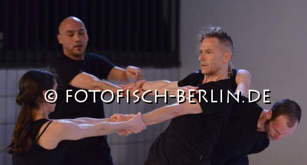 Ort: Uferstudio 1. Tanzcompagnie Rubato. Titel: UNCERTAIN STATES. Urauffuehrung: 18.3.2015. Kuenstlerische Leitung, Idee, Buehne: Jutta Hell, Dieter Baumann. Inszenierung, Choreografie, Kostuem: Jutta Hell. Musik: Da Bao. Licht: Fabian Bleisch. Tanz, Choreografie: Mercedes Appugliese, Anja Sielaff, Dieter Baumann, Carlos Osatinsky, Fernando Pelliccioli. Im Bild: Dieter Baumann, Mercedes Appugliese, Carlos Osatinsky, Fernando Pelliccioli, Anja Sielaff