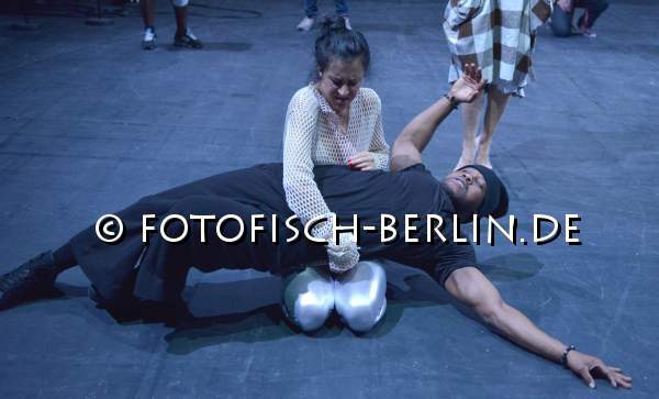 Ort: Hebbel am Ufer, hau 1. Gintersdorfer_Klaßen. Titel: Exorzieren statt Exerzieren. Premiere: 26.3.2015. Produktion: Gintersdorfer_Klaßen. Mit: Cecilia Bengolea, Alexander Cephus, Gotta Depri, Hauke Heumann, Peter Ott, Eric Parfait Francis Taregue, Margarita Tsomou, Franck Edmond Yao. Im Bild: Cecilia Bengolea, Franck Edmond Yao