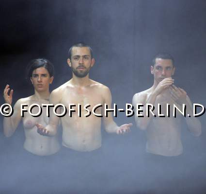 Ort: Sophiensaele. Lea Moro. Titel: (B)REACHING STILLNESS. Premiere: 04.06.2015. Konzept, Choreografie, Tanz: Lea Moro. Co-Choreografie, Tanz: Enrico Ticconi, Jorge De Hoyos. Licht: Annegret Schalke. Kostuem: Lydia Sonderegger. Klangregie: Marcus Thomas. Im Bild: Jorge De Hoyos, Lea Moro, Enrico Ticconi