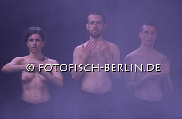 Ort: Sophiensaele. Lea Moro. Titel: (B)REACHING STILLNESS. Premiere: 04.06.2015. Konzept, Choreografie, Tanz: Lea Moro. Co-Choreografie, Tanz: Enrico Ticconi, Jorge De Hoyos. Licht: Annegret Schalke. Kostuem: Lydia Sonderegger. Klangregie: Marcus Thomas. Im Bild: Jorge De Hoyos, Lea Moro, Enrico Ticconi