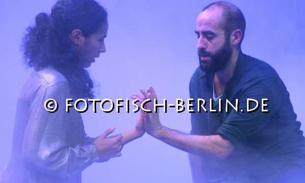 Ort: Sophiensaele. Christoph Winkler. Titel: GOLDEN STARS ON BLUE _ A SONIC TABLEAU. Premiere: 15.10.2015. Konzept: Christoph Winkler. Licht: Arne Schmitt. Musik: Europahymne, Paul Stretch, Tian Rotteveel. Von und mit: Karima El Amrani, Aimée Lagrange, Pietro Pireddu, Ahmed Soura, Aloalii Naughton Tapu, Naishi Wang Im Bild: Karima El Amrani, Pietro Pireddu