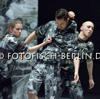 Ort: Hebbel am Ufer, hau 2. Kat Valastur. Titel: OILINITY. Trilogie_The marginal Sculptures of NewTopia. Premiere: 28.04.2016 Choreografie, Konzept: Kat Valastur. Licht: Martin Beeretz. Buehne: Laila Rosato. Kostueme: Lydia Sonderegger. Tanz: Nitsan Margaliot, Enrico Ticconi, Marysia Zimpel. Im Bild: Marysia Zimpel, Enrico Ticconi, Nitsan Margaliot