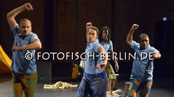 Ort: Sophiensaele. Flinn Works + Asedeva. Titel: MAJI MAJI FLAVA. Postkoloniale Theaterperformance. Choreografie: Isack Peter Abeneko. Regie: Sophia Stepf. Ausstatung: Brigitte Schima. Musikalische Leitung: Jan S. Beyer. Mit: Isack Peter Abeneko, Jan S. Beyer, Sabrina Ceesay, Konradin Kunze, Shabani Mugado, Lisa Stepf Im Bild: Ensemble Flinnworks