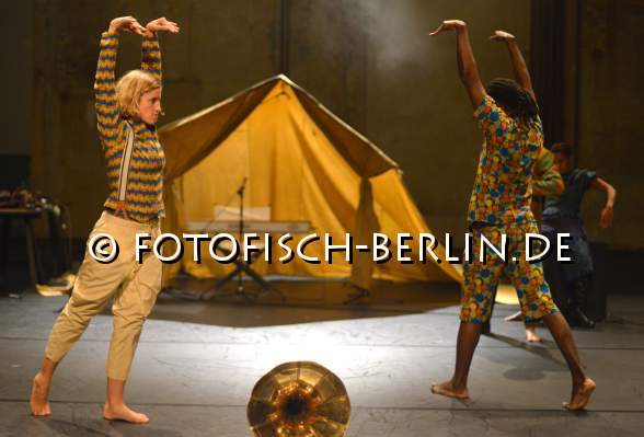 Ort: Sophiensaele. Flinn Works + Asedeva. Titel: MAJI MAJI FLAVA. Postkoloniale Theaterperformance. Choreografie: Isack Peter Abeneko. Regie: Sophia Stepf. Ausstatung: Brigitte Schima. Musikalische Leitung: Jan S. Beyer. Mit: Isack Peter Abeneko, Jan S. Beyer, Sabrina Ceesay, Konradin Kunze, Shabani Mugado, Lisa Stepf Im Bild: Ensemble Flinnworks