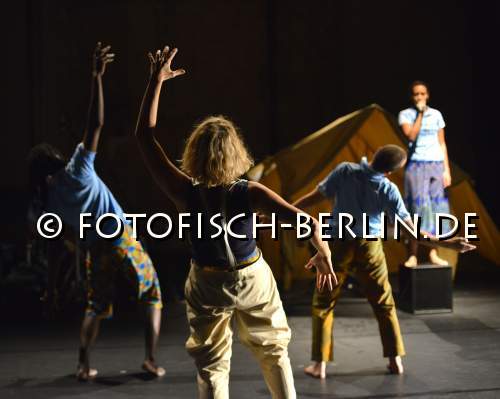 Ort: Sophiensaele. Flinn Works + Asedeva. Titel: MAJI MAJI FLAVA. Postkoloniale Theaterperformance. Choreografie: Isack Peter Abeneko. Regie: Sophia Stepf. Ausstatung: Brigitte Schima. Musikalische Leitung: Jan S. Beyer. Mit: Isack Peter Abeneko, Jan S. Beyer, Sabrina Ceesay, Konradin Kunze, Shabani Mugado, Lisa Stepf Im Bild: Ensemble Flinnworks