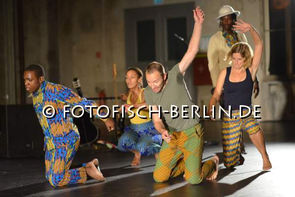 Ort: Sophiensaele. Flinn Works + Asedeva. Titel: MAJI MAJI FLAVA. Postkoloniale Theaterperformance. Choreografie: Isack Peter Abeneko. Regie: Sophia Stepf. Ausstatung: Brigitte Schima. Musikalische Leitung: Jan S. Beyer. Mit: Isack Peter Abeneko, Jan S. Beyer, Sabrina Ceesay, Konradin Kunze, Shabani Mugado, Lisa Stepf Im Bild: Ensemble Flinnworks