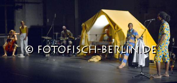 Ort: Sophiensaele. Flinn Works + Asedeva. Titel: MAJI MAJI FLAVA. Postkoloniale Theaterperformance. Choreografie: Isack Peter Abeneko. Regie: Sophia Stepf. Ausstatung: Brigitte Schima. Musikalische Leitung: Jan S. Beyer. Mit: Isack Peter Abeneko, Jan S. Beyer, Sabrina Ceesay, Konradin Kunze, Shabani Mugado, Lisa Stepf Im Bild: Ensemble Flinnworks