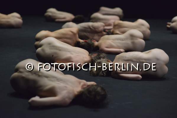 Ort: Hebbel am Ufer, hau2. Isabelle Schad. Titel: PIECES AND ELEMENTS. Premiere: 25.11.2016. Konzept, Choreografie: Isabelle Schad. Licht: Medi Toutain-Lopez. Sound: Damir Simunovic. Kostueme: Charlotte Pistorius. Mit: Jozefien Beckers, Barbara Berti, Frederike Doffin, Naima Ferre, Josephine Findeisen, Prezemek Kaminski, Mathis Kleinschnittger, Manuel Lindner, Adi Shildan, Claudia Tomasi, Nir Vidan, Naralia Wild. Im Bild: Ensemble