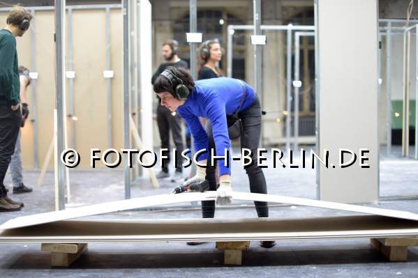 Ort: Sophiensaele Berlin. Daniel Koetter, Hannes Seidl Titel: STADT (LAND FLUSS). PREMIERE: 16.11.2017. Kuenstlerische Leitung: Daniel Koetter, Hannes Seidl. Elektromagnetische Klaenge: Christina Kubisch. Musik, Performance: Sebastian Berweck, Martin Lorenz, Andrea Neumann. Raum: Paul Zoller Im Bild: Generalprobe mit Zuschauern