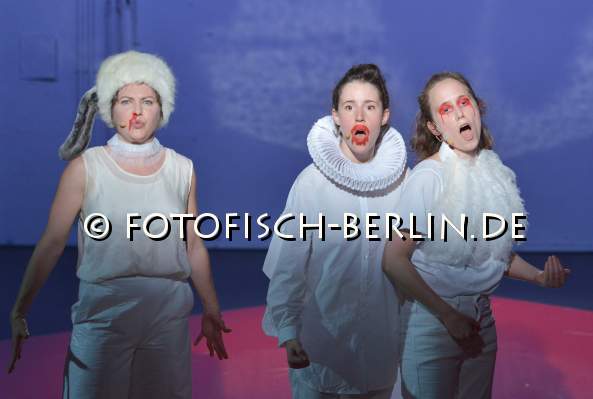 Ort: Sophiensaele Berlin. Kareth Schaffer. Titel: CASSANDRA HAS TURNED 2. Premiere: 18.04.2018. Choreografie, Libretto: Kareth Schaffer. Licht: Joseph Wegemann. Sound: Alessio Castellacci. Buehne, Kostueme: Olga Sonja Thorarensen. Performance: Manon Parent, Lisa Vereerbrugghen, Cathy Walsh. Im Bild: Manon Parent, Lisa Vereerbrugghen, Cathy Walsh