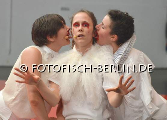 Ort: Sophiensaele Berlin. Kareth Schaffer. Titel: CASSANDRA HAS TURNED 2. Premiere: 18.04.2018. Choreografie, Libretto: Kareth Schaffer. Licht: Joseph Wegemann. Sound: Alessio Castellacci. Buehne, Kostueme: Olga Sonja Thorarensen. Performance: Manon Parent, Lisa Vereerbrugghen, Cathy Walsh. Im Bild: Manon Parent, Lisa Vereerbrugghen, Cathy Walsh