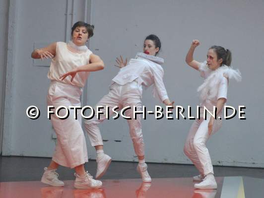 Ort: Sophiensaele Berlin. Kareth Schaffer. Titel: CASSANDRA HAS TURNED 2. Premiere: 18.04.2018. Choreografie, Libretto: Kareth Schaffer. Licht: Joseph Wegemann. Sound: Alessio Castellacci. Buehne, Kostueme: Olga Sonja Thorarensen. Performance: Manon Parent, Lisa Vereerbrugghen, Cathy Walsh. Im Bild: Manon Parent, Lisa Vereerbrugghen, Cathy Walsh