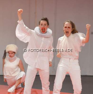 Ort: Sophiensaele Berlin. Kareth Schaffer. Titel: CASSANDRA HAS TURNED 2. Premiere: 18.04.2018. Choreografie, Libretto: Kareth Schaffer. Licht: Joseph Wegemann. Sound: Alessio Castellacci. Buehne, Kostueme: Olga Sonja Thorarensen. Performance: Manon Parent, Lisa Vereerbrugghen, Cathy Walsh. Im Bild: Manon Parent, Lisa Vereerbrugghen, Cathy Walsh