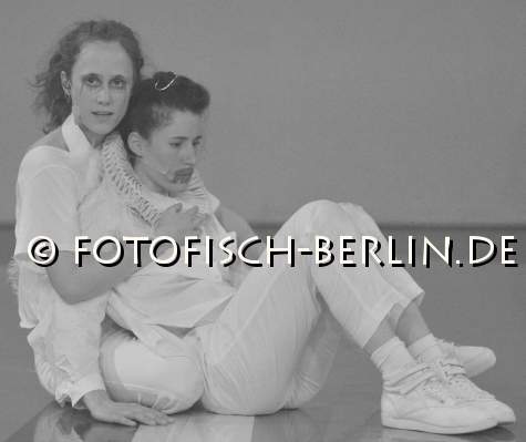 Ort: Sophiensaele Berlin. Kareth Schaffer. Titel: CASSANDRA HAS TURNED 2. Premiere: 18.04.2018. Choreografie, Libretto: Kareth Schaffer. Licht: Joseph Wegemann. Sound: Alessio Castellacci. Buehne, Kostueme: Olga Sonja Thorarensen. Performance: Manon Parent, Lisa Vereerbrugghen, Cathy Walsh. Im Bild: Lisa Vereerbrugghen, Manon Parent