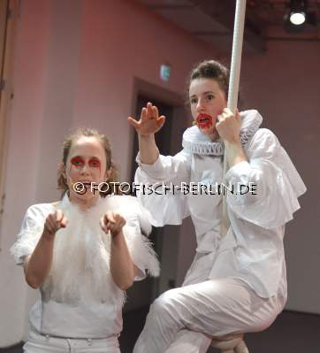 Ort: Sophiensaele Berlin. Kareth Schaffer. Titel: CASSANDRA HAS TURNED 2. Premiere: 18.04.2018. Choreografie, Libretto: Kareth Schaffer. Licht: Joseph Wegemann. Sound: Alessio Castellacci. Buehne, Kostueme: Olga Sonja Thorarensen. Performance: Manon Parent, Lisa Vereerbrugghen, Cathy Walsh. Im Bild: Lisa Vereerbrugghen, Manon Parent