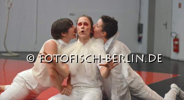 Ort: Sophiensaele Berlin. Kareth Schaffer. Titel: CASSANDRA HAS TURNED 2. Premiere: 18.04.2018. Choreografie, Libretto: Kareth Schaffer. Licht: Joseph Wegemann. Sound: Alessio Castellacci. Buehne, Kostueme: Olga Sonja Thorarensen. Performance: Manon Parent, Lisa Vereerbrugghen, Cathy Walsh. Im Bild: Manon Parent, Lisa Vereerbrugghen, Cathy Walsh