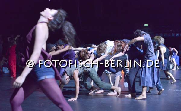 Ort: Radialsystem V. Sasha Waltz & Guests. Titel: EXODOS. Urauffuehrung: 23.08.2018. Regie und Choreographie: Sasha Waltz. Buehne: Heike Schuppelius und Sasha Waltz. Kostueme: Federico Polucci und Sasha Waltz & Guests. Licht: Urs Schoenebaum. Musik: Soundwalk Collective. Tanz und Choreographie: Tanz und Choreographie: Sasha Waltz & Guests Im Bild: Sasha Waltz & Guests, Oeffentliche Probe mit Publikum.