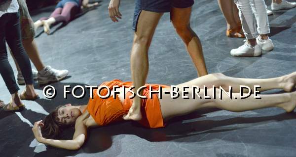 Ort: Radialsystem V. Sasha Waltz & Guests. Titel: EXODOS. Urauffuehrung: 23.08.2018. Regie und Choreographie: Sasha Waltz. Buehne: Heike Schuppelius und Sasha Waltz. Kostueme: Federico Polucci und Sasha Waltz & Guests. Licht: Urs Schoenebaum. Musik: Soundwalk Collective. Tanz und Choreographie: Tanz und Choreographie: Sasha Waltz & Guests Im Bild: Sasha Waltz & Guests, Oeffentliche Probe mit Publikum.