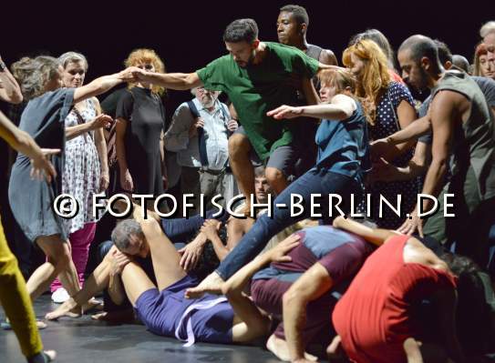 Ort: Radialsystem V. Sasha Waltz & Guests. Titel: EXODOS. Urauffuehrung: 23.08.2018. Regie und Choreographie: Sasha Waltz. Buehne: Heike Schuppelius und Sasha Waltz. Kostueme: Federico Polucci und Sasha Waltz & Guests. Licht: Urs Schoenebaum. Musik: Soundwalk Collective. Tanz und Choreographie: Tanz und Choreographie: Sasha Waltz & Guests Im Bild: Sasha Waltz & Guests, Oeffentliche Probe mit Publikum.