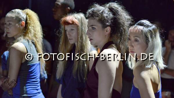 Ort: Radialsystem V. Sasha Waltz & Guests. Titel: EXODOS. Urauffuehrung: 23.08.2018. Regie und Choreographie: Sasha Waltz. Buehne: Heike Schuppelius und Sasha Waltz. Kostueme: Federico Polucci und Sasha Waltz & Guests. Licht: Urs Schoenebaum. Musik: Soundwalk Collective. Tanz und Choreographie: Tanz und Choreographie: Sasha Waltz & Guests Im Bild: Sasha Waltz & Guests, Oeffentliche Probe mit Publikum.