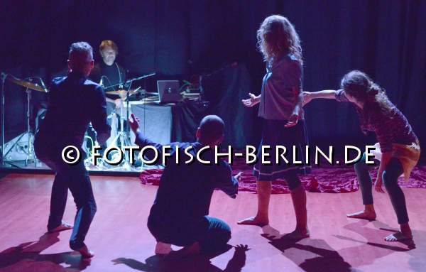 Ort: Uferstudio 1. Tanzcompagnie Rubato. Titel: blue-sky thinking. Urauffuehrung: 14.11.2018. Inszenierung, Choreografie: Jutta Hell Tanz, Choreografie: Dieter Baumann, Alessandra Defazio, Carlos Osatinsky, Anja Sielaff. Komposition, Live Musik: Alexander Nickmann. Licht: Fabian Bleisch. Kostueme: Jutta Hell, Claudia Janitschek. Im Bild: Dieter Baumann, Alessandra Defazio, Carlos Osatinsky, Anja Sielaff. Alexander Nickmann