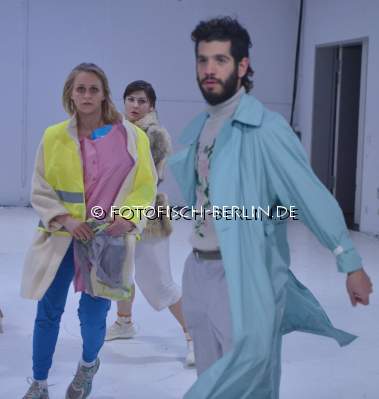Ort: Sophiensaele. Cecile Bally. Titel: THE PRICE IS RIGHT. Choreographie, Buehne: Cecile Bally. LICHTDESIGN: Eva Alonso. Kostuemdesign: Sara Wendt. PERFORMANCE: Asaf Aharonson, Cathy Walsh, Marie Ursin Im Bild: Asaf Aharonson, Cathy Walsh, Marie Ursin