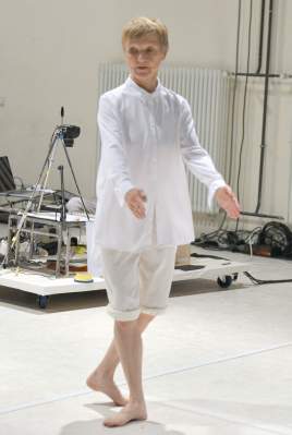 Ort: Uferstudios Berlin. Riki von Falken. Titel: DIE ARCHITEKTUR EINER LINIE. Premiere: 19.09.2019. Konzept: Riki von Falken, Oscar Loeser. Choreografie, Tanz: Riki von Falken. Videografik: Oscar Loeser. Livesound: Ralf Grueneberg. Licht: Clemens Kowalski. Koestuem: Heather Maccrimmon. Im Bild: Riki von Falken
