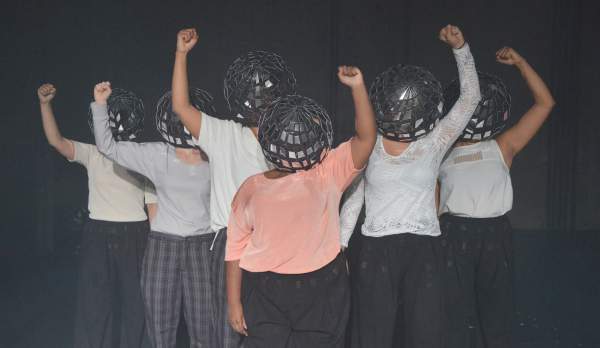 Ort: Sophiensaele Berlin. Simone Dede Ayivi und Kompliz*innen. Titel: SOLIDARITAETSSTUECK. Premiere: 27.09.2019. Text, Performance: Simone Dede Ayivi. Choreografie: Bhar Meric. Kostueme, Buehne: Charlotte Pistorius. Licht,Buehne: Rosa Wernecke. Sound,Musik: Katharina Pelosi. Chor: Kira Lorenza Althaler, Maria Ringelstein, Paula Führer, Yemisi Babatola, Tara Sanaaty, Vivian Fogain, Leonie Schramm, Azadeh Shafiei, Elena Iris Fichtner, Jocelina Ndimbalan. Im Bild: Szenenfoto Ensemble
