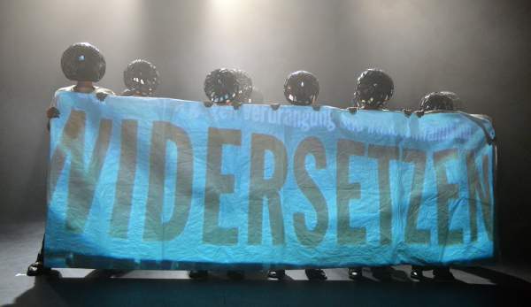 Ort: Sophiensaele Berlin. Simone Dede Ayivi und Kompliz*innen. Titel: SOLIDARITAETSSTUECK. Premiere: 27.09.2019. Text, Performance: Simone Dede Ayivi. Choreografie: Bhar Meric. Kostueme, Buehne: Charlotte Pistorius. Licht,Buehne: Rosa Wernecke. Sound,Musik: Katharina Pelosi. Chor: Kira Lorenza Althaler, Maria Ringelstein, Paula Führer, Yemisi Babatola, Tara Sanaaty, Vivian Fogain, Leonie Schramm, Azadeh Shafiei, Elena Iris Fichtner, Jocelina Ndimbalan. Im Bild: Szenenfoto Ensemble