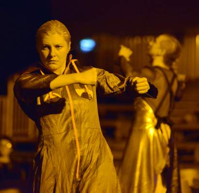 Ort: Sophiensaele Berlin. Festival_DAS OST WEST DING. 15.10.-10.11.2019. Jule Flierl, Mars Dietz: Titel: WISMUT_A NUCLEAR CHOIR. Premiere: 17.10.2019. Konzept, Choreografie: Jule Flierl. Konzept, Installation,Sound: Mars Dietz. Licht: Gretchen Blegen. Kostuem: Claudia Hill. Nuclear-Kern: Zoe Knights, Zwoisy Mears-Clarke, Cathy Walsh. Im Bild: Ensemble, Generalprobe mit Zuschauern