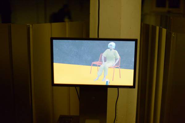 Ort: Sophiensaele Berlin. Festival_DAS OST WEST DING. 15.10.-10.11.2019. Caroline Creutzburg. Titel: WABE ( ) OST. Digital Media Installation. Computer-Avatare im Gespraech. Konzept, kuenstlerische Leitung: Caroline Creutzburg. Cross Media and technical art: Todor Stoyanov. Raum: David Reiber Otalora. Im Bild: Eroeffnung mit Publikum.