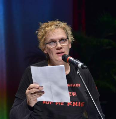 Ort: Sophiensaele Berlin. Festival_DAS OST WEST DING. 15.10.-10.11.2019. DIE GALA. GESPRAECHSREVUE. 01.11.2019. Mit Beitraegen von: Barbara Gronau, Anett Groeschner, hannsjana, Mai-Phuong Kollath, Adriana Lettrari, Luise Meier, Patrice G. Poutrus, Tucke Royale, Kareth Schaffer, Rike Flaemig, Nadja Schallenberg, Nele Stuhler, Matthias Vernaldi, Sarah Mouwani, Jessy James La Fleur,Imran Ayata, Katrin hattenhauer. Moderation: Gisela Sommer und Inge Borg. MUSIK: Sebastian Bertram Trio. Im Bild: Szenenfoto DIE GALA, Nadja Schallenberg