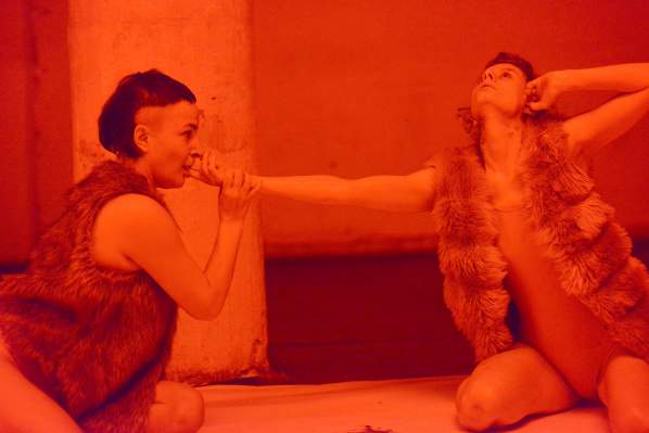 Ort: Sophiensaele Berlin. Tanztage Berlin 2020. 08.-18.01.2020. Suvi Kemppainen, Josefine Muehle. Titel: A CHILD HAS BEEN BEATEN. Premiere: 13.01.2020. Sound, Licht, Video: Suvi Kemppainen, Josefine Muehle. Gastperformance: Camille Kaese. Choreografie, Performance: Suvi Kemppainen, Josefine Muehle. Im Bild: Suvi Kemppainen, Josefine Muehle.