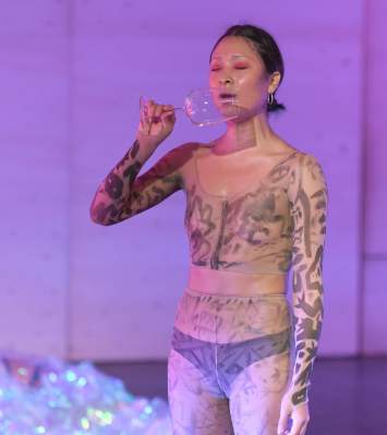 Ort: Sophiensaele Berlin. Tanztage Berlin 2020. 08.-18.01.2020. Maque Pereyra. Titel: SOLAR THRESHOLD. Premiere: 16.01.2020. Konzept, Kostuem, Performance: Maque Pereyra. Sound: Mars Dietz. Licht: Hanna Kritten tangsoo. Performance: Pauline Bulin,Claudia Sáez Fernández, Sharón Mercado, Maque Pereyra, Anisha Mueller, Zuréh Jaramillo Im Bild: Maque Pereyra