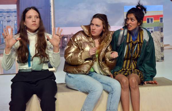Ort: Sophiensaele Berlin. Cecile Bally. Titel: THE END OF THE ROAD. Premiere: 13.02.2020. KONZEPT, CHOREOGRAFIE, PERFORMANCE: Cecile Bally. SOUNDdesign: Jassem Hindi. LICHTDESIGN: Emma Juliard. BUEHNENBILD: Pablo Ramon Benitez. KOSTUEME: Sara Wendt. RAPtitel: Haszcara. PERFORMANCE: Julia Plawgo, Layton Lachmann, Sunayana Shetty. Im Bild: Julia Plawgo, Sunayana Shetty, Cecile Bally