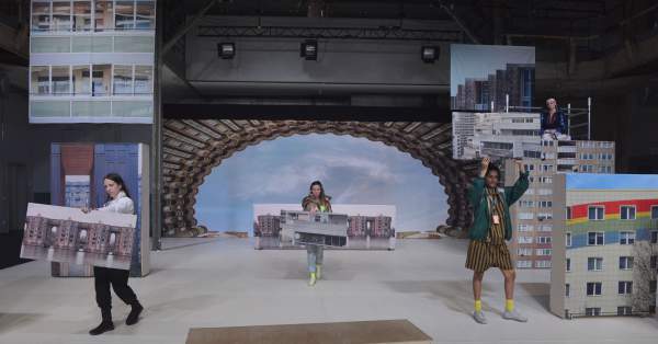 Ort: Sophiensaele Berlin. Cecile Bally. Titel: THE END OF THE ROAD. Premiere: 13.02.2020. KONZEPT, CHOREOGRAFIE, PERFORMANCE: Cecile Bally. SOUNDdesign: Jassem Hindi. LICHTDESIGN: Emma Juliard. BUEHNENBILD: Pablo Ramon Benitez. KOSTUEME: Sara Wendt. RAPtitel: Haszcara. PERFORMANCE: Julia Plawgo, Layton Lachmann, Sunayana Shetty. Im Bild: Julia Plawgo, Sunayana Shetty, Cecile Bally,Layton Lachmann