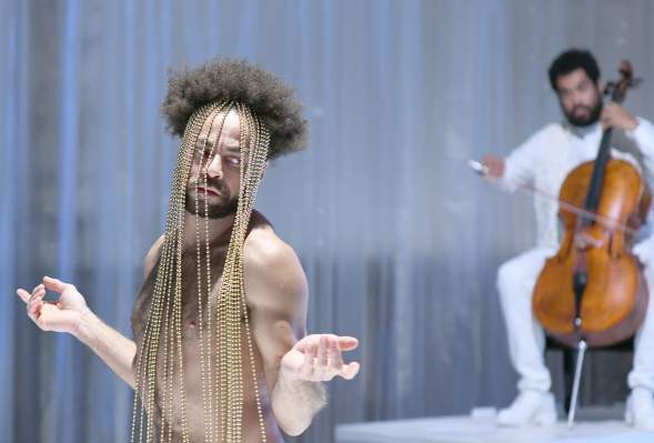 Ort: Ballhaus Naunynstraße. Jasco Viefhues. Titel: Complex of Tensions. Urauffuehrung: 09.10.2020. Choreografie: Ronni Maciel. Text & Regie: Jasco Viefhues. Buehnenbild: Marian Nketiah. Kostuem: Andreina Vieira dos Santos. Lichtdesign: Emilio Cordero Checa. Musik/ Performance: Eurico Ferreira Mathias. Performance: Aloysius Itoka, Ronni Maciel. Im Bild: Eurico Ferreira Mathias, Ronni Maciel