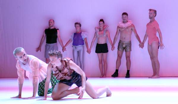 Titel: Ayelen Parolin_RUDA_WEG. Deutschlandpremiere: 06.08.2021. Choreografie: Ayelen Parolin. Musik u. Piano: Lea Petra. Licht: Laurence Halloy. Koestueme: Wim Muyllaert. Tanz: Daniel Barkan, Baptiste Cazaux, Jeanne Colin, Piet Defrancq, Daan Jaartsveld, Dan Mussett, Bianca Zueneli. Im Bild: Ensemble