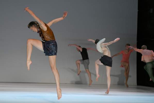 Titel: Ayelen Parolin_RUDA_WEG. Deutschlandpremiere: 06.08.2021. Choreografie: Ayelen Parolin. Musik u. Piano: Lea Petra. Licht: Laurence Halloy. Koestueme: Wim Muyllaert. Tanz: Daniel Barkan, Baptiste Cazaux, Jeanne Colin, Piet Defrancq, Daan Jaartsveld, Dan Mussett, Bianca Zueneli. Im Bild: Ensemble