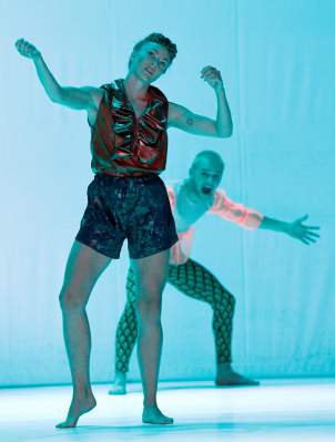 Titel: Ayelen Parolin_RUDA_WEG. Deutschlandpremiere: 06.08.2021. Choreografie: Ayelen Parolin. Musik u. Piano: Lea Petra. Licht: Laurence Halloy. Koestueme: Wim Muyllaert. Tanz: Daniel Barkan, Baptiste Cazaux, Jeanne Colin, Piet Defrancq, Daan Jaartsveld, Dan Mussett, Bianca Zueneli.