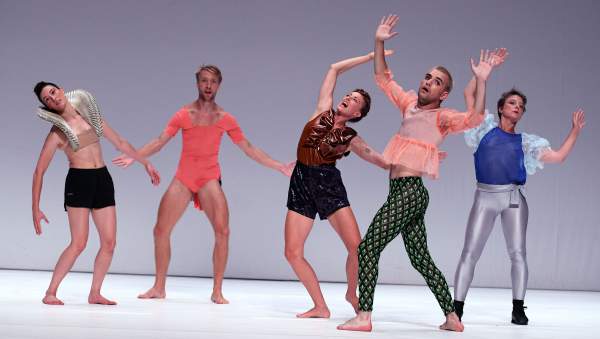 Titel: Ayelen Parolin_RUDA_WEG. Deutschlandpremiere: 06.08.2021. Choreografie: Ayelen Parolin. Musik u. Piano: Lea Petra. Licht: Laurence Halloy. Koestueme: Wim Muyllaert. Tanz: Daniel Barkan, Baptiste Cazaux, Jeanne Colin, Piet Defrancq, Daan Jaartsveld, Dan Mussett, Bianca Zueneli. Im Bild: Ensemble