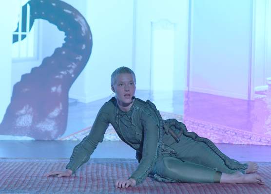Tanz im August 2021. St. Elisabeth-Kirch. Colette Sadler mit Mikko Gaestel. Titel: ARK 1. Urauffuehrung: 13.08.2021. Choreografie, Text und Kuenstlerische Leitung: Colette Sadler. Video, Installation: Mikko Gaestel. Kostuem: Colette Sadler, Theo Clinkard. Sound: Samir Kennedy, Heiko Tubbesing. Performance: Leah Marojevic. Im Bild: Leah Marojevic